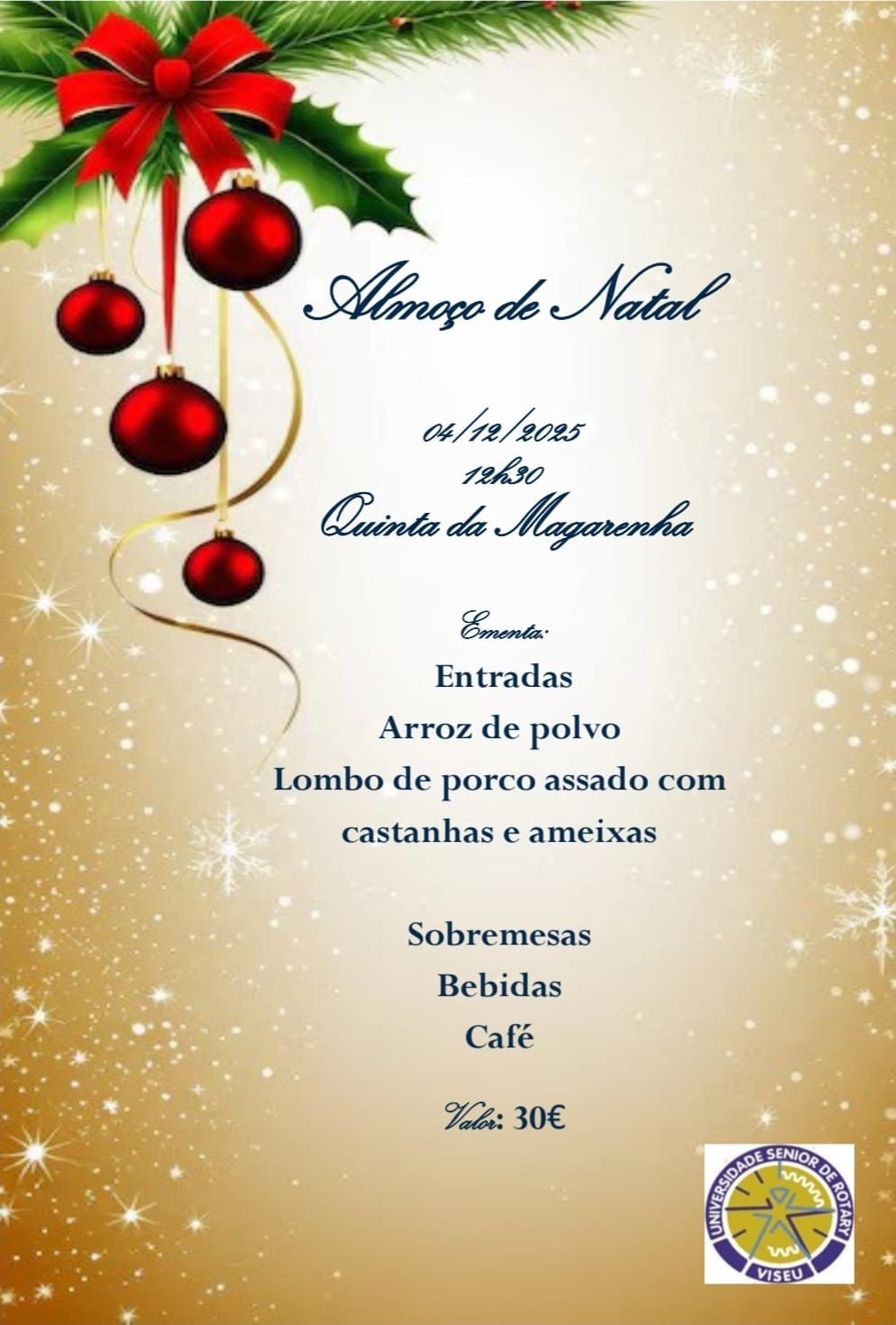 Dia 4 de Dezembro realiza-se o almoço de Natal da família USAVIS, pelas 12,30h na Quinta da Margarenha. As inscrições podem ser realizadas na secretaria da USAVIS